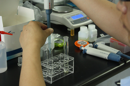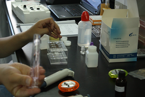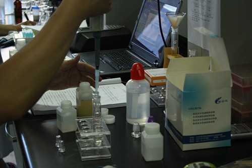 4、 取兩根試管,分別作為樣品管和對(duì)照管。在樣品管加入3ml樣品液,在對(duì)照管中加入3ml緩沖液,隨后分別加入20ul顯色劑和50ul酶試劑。蓋塞混勻靜置10min。
