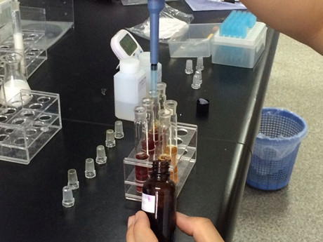 2、取6根試管,1-5號試管作為樣品管,6號為對照管。在樣品管加入3ml樣品液,在對照管中加入3ml緩沖液,隨后分別加入20ul顯色劑和50ul酶試劑,蓋塞混勻靜置10min。