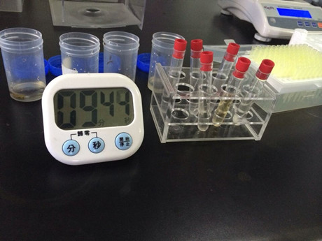 1、稱取0.1g茶葉樣品于樣品提取瓶中,加8ml農(nóng)殘緩沖液,8ml緩沖液震蕩提取30秒,靜置2分鐘。