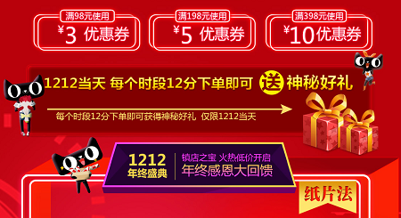 你還在為“雙11”沒享受到優(yōu)惠而惋惜么?那么現(xiàn)在補(bǔ)救的機(jī)會(huì)來了,2015年最后一波,天貓ZYD旗艦店“雙12 ”讓我們?cè)汆诉@一次,把“雙11”沒搶到的補(bǔ)回來。為了感謝新老客戶對(duì)我們店鋪長久以來的支持,在雙12活動(dòng)期間,我們推出了以下活動(dòng),感恩回饋各位: