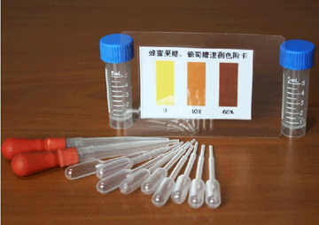 蜂蜜中的果糖和葡萄糖與顯色劑反應生成有色化合物,采用目視比色分析方法,直接在速測色階卡上讀出果糖和葡萄糖含量。