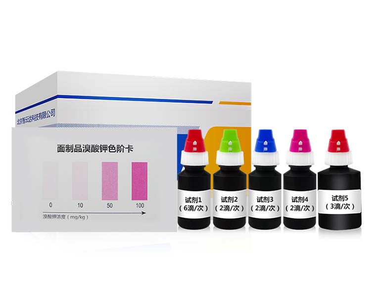 3.打開顯色管蓋,用吸管吸取樣品上清液于另一只顯色管1毫升刻線處,加入溴酸鉀試劑(三)2滴,加入溴酸鉀試劑(四)2滴,再加入溴酸鉀試劑(五)3滴,蓋上顯色管蓋,上下搖動六次,放置30秒顯色。 4.30秒鐘后,與面制品中溴酸鉀色 階卡比較,判斷樣品中溴酸鉀含量。