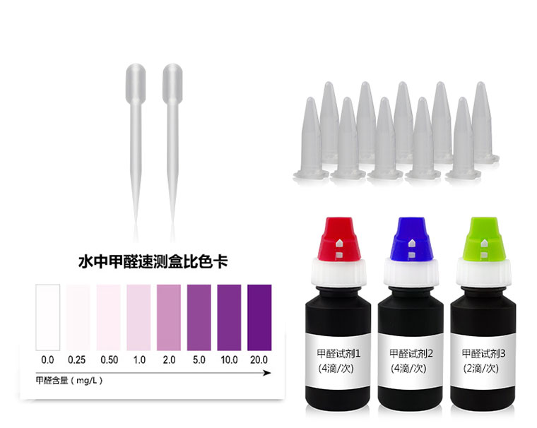 1. 取1.0mL水樣加入到1.5mL離心管中,加入4滴甲醛試劑1,再加入4滴甲醛試劑2,蓋蓋后混勻,1分鐘后,加2滴甲醛試劑3,搖勻,5~10分鐘內(nèi),與比色卡對比得到水中甲醛含量。