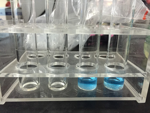 首先對兩種油樣進行編號,分別分為1號和2號,之后滴加6滴油樣到比色管中,加入1ml試劑1,搖晃震蕩30秒之后沸水浴5分鐘,冷卻下來與標準對比顏色,如果顏色與標準相似或者顏色更深與標準則為地溝油。