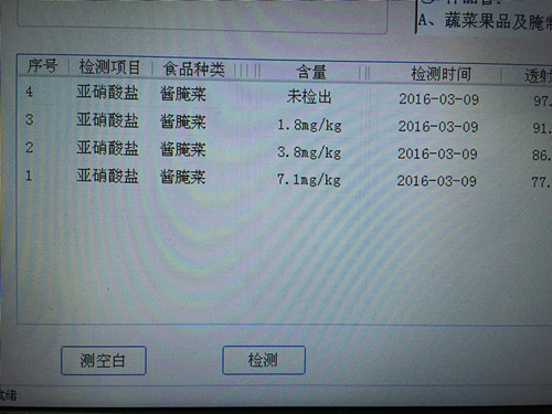 將裝有空白溶液及樣品液的比色皿放入儀器內(nèi)檢測,檢測結(jié)果如圖所示。從上到下分別為1號、3號、12號、14號樣品中亞硝酸鹽含量的檢測,結(jié)果顯示均符合國家標(biāo)準(zhǔn)。